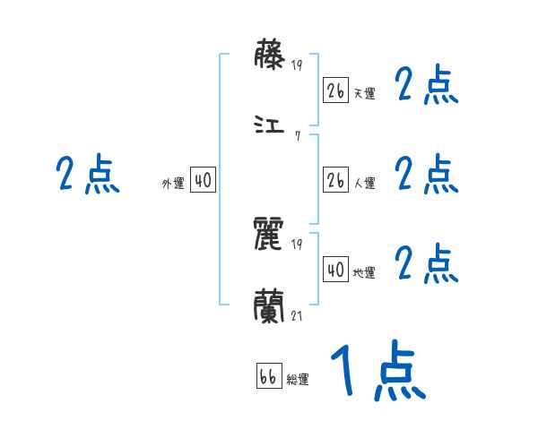 天運![]() | 藤江麗蘭さんの天運は26画の2つ星!波瀾万丈かも。信頼できる人を大事にしましょう。 家系が持つ宿命的な運勢を表します。祖先から受け継いだ苗字ですので自分の力が及びません。家柄を象徴します。 |