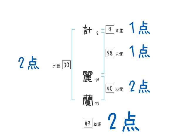 総運![]() | 計麗蘭さんの総運は49画の2つ星!不安定な性格で明暗がある人生。周りの人には支援されやすい。 あなたの人生を表す1番重要な運勢です。生涯を通じて影響する総合運となり、主に50歳以降の晩年期に影響を及ぼします。 |