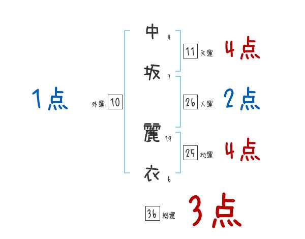 天運![]() | 中坂麗衣さんの天運は11画の4つ星!着実に富や地位を得る幸運な人生。 家系が持つ宿命的な運勢を表します。祖先から受け継いだ苗字ですので自分の力が及びません。家柄を象徴します。 |