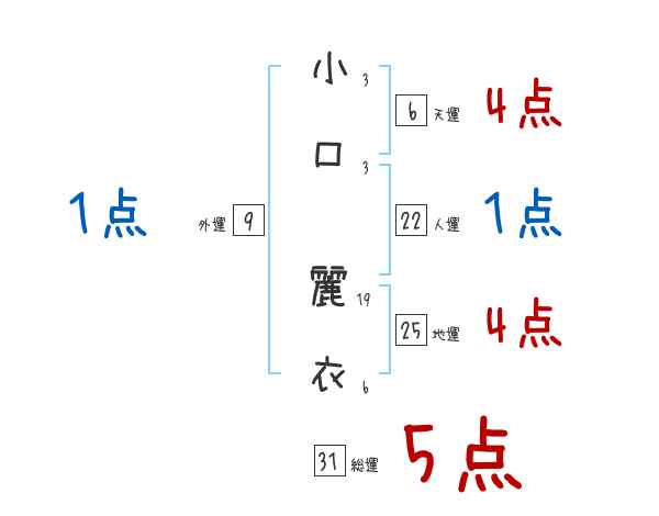 天運![]() | 小口麗衣さんの天運は6画の4つ星!慎重な努力家で信頼を得る。誠実な精神で向上心に優れる。 家系が持つ宿命的な運勢を表します。祖先から受け継いだ苗字ですので自分の力が及びません。家柄を象徴します。 |