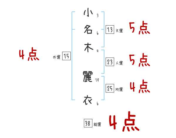 天運![]() | 小名木麗衣さんの天運は13画の5つ星!才能に恵まれ人気がある。名声を手に入れる。円満な人生。 家系が持つ宿命的な運勢を表します。祖先から受け継いだ苗字ですので自分の力が及びません。家柄を象徴します。 |