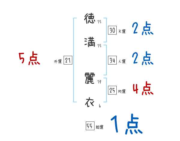 天運![]() | 徳満麗衣さんの天運は30画の2つ星!浮き沈みの激しさに注意しましょう。 家系が持つ宿命的な運勢を表します。祖先から受け継いだ苗字ですので自分の力が及びません。家柄を象徴します。 |