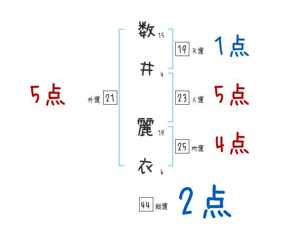天運![]() | 数井麗衣さんの天運は19画の1つ星!優れた才能を持ちますが、協調性が足りないことも。周りの人と協力する事を意識しましょう。 家系が持つ宿命的な運勢を表します。祖先から受け継いだ苗字ですので自分の力が及びません。家柄を象徴します。 |