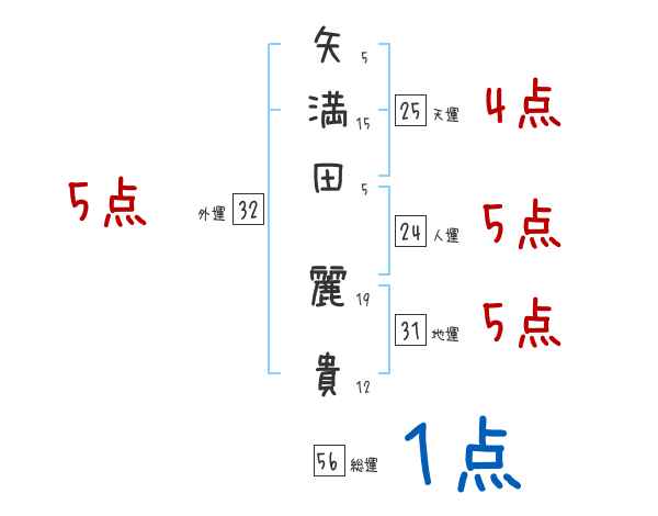 外運![]() | 矢満田麗貴さんの外運は32画の5つ星!柔軟性があり成功する。チャンスが多く金運が良い。 生活面を象徴する運勢です。外部から受ける影響力を表し、結婚運、家庭運や職場、環境への順応性を表します。 |