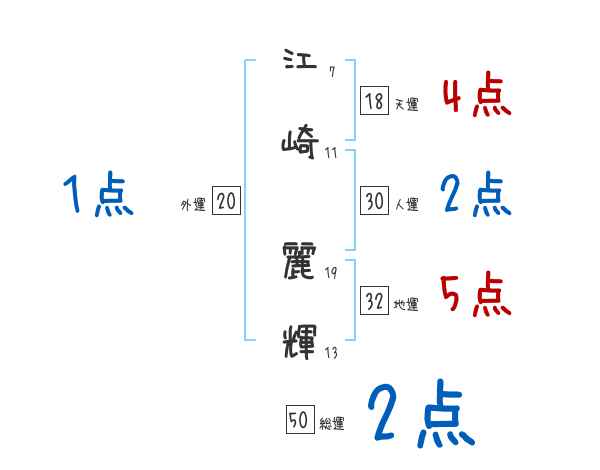 天運![]() | 江崎麗輝さんの天運は18画の4つ星!情熱的で剛気。忍耐力があり信頼される。 家系が持つ宿命的な運勢を表します。祖先から受け継いだ苗字ですので自分の力が及びません。家柄を象徴します。 |