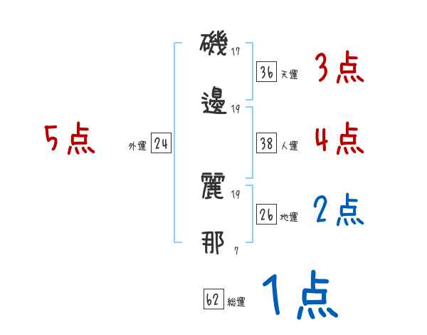 外運![]() | 磯邊麗那さんの外運は24画の5つ星!家庭運が良く順調な人生。金運にも恵まれる。 生活面を象徴する運勢です。外部から受ける影響力を表し、結婚運、家庭運や職場、環境への順応性を表します。 |