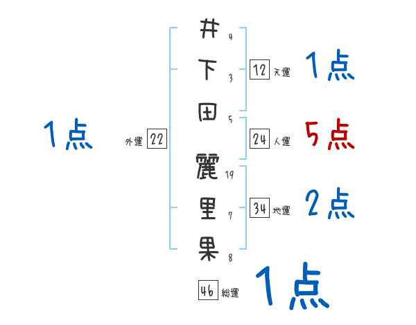 総運![]() | 井下田麗里果さんの総運は46画の1つ星!迷走することが多く苦労するかも。目先のことにとらわれないように。 あなたの人生を表す1番重要な運勢です。生涯を通じて影響する総合運となり、主に50歳以降の晩年期に影響を及ぼします。 |