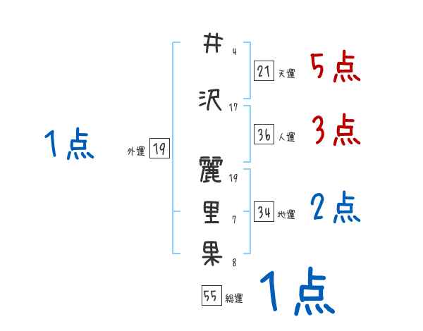 天運![]() | 井沢麗里果さんの天運は21画の5つ星!統率力がある。独立し成功する。名誉を手に入れる。 家系が持つ宿命的な運勢を表します。祖先から受け継いだ苗字ですので自分の力が及びません。家柄を象徴します。 |