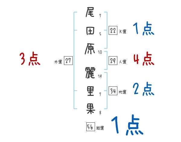 外運![]() | 尾田原麗里果さんの外運は27画の3つ星!頭脳明晰だが強情で摩擦が多い傾向。孤立に注意。 生活面を象徴する運勢です。外部から受ける影響力を表し、結婚運、家庭運や職場、環境への順応性を表します。 |