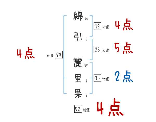 天運![]() | 綿引麗里果さんの天運は18画の4つ星!情熱的で剛気。忍耐力があり信頼される。 家系が持つ宿命的な運勢を表します。祖先から受け継いだ苗字ですので自分の力が及びません。家柄を象徴します。 |