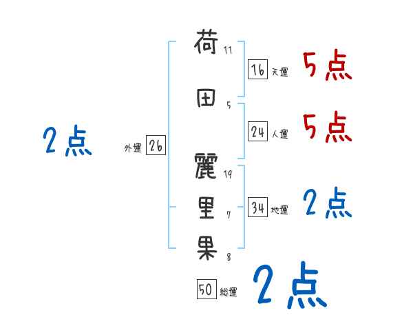 外運![]() | 荷田麗里果さんの外運は26画の2つ星!波瀾万丈かも。信頼できる人を大事にしましょう。 生活面を象徴する運勢です。外部から受ける影響力を表し、結婚運、家庭運や職場、環境への順応性を表します。 |