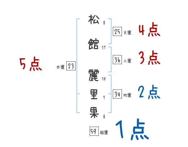天運![]() | 松館麗里果さんの天運は25画の4つ星!個性があり才能があふれる。強運の持ち主で発展する。 家系が持つ宿命的な運勢を表します。祖先から受け継いだ苗字ですので自分の力が及びません。家柄を象徴します。 |