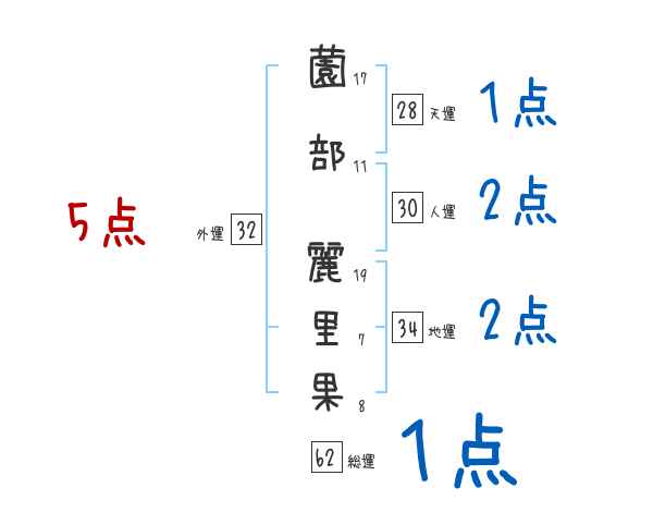 外運![]() | 薗部麗里果さんの外運は32画の5つ星!柔軟性があり成功する。チャンスが多く金運が良い。 生活面を象徴する運勢です。外部から受ける影響力を表し、結婚運、家庭運や職場、環境への順応性を表します。 |