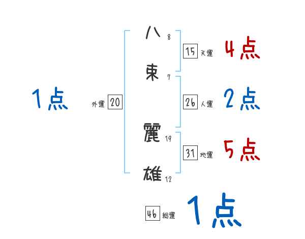総運![]() | 八束麗雄さんの総運は46画の1つ星!迷走することが多く苦労するかも。目先のことにとらわれないように。 あなたの人生を表す1番重要な運勢です。生涯を通じて影響する総合運となり、主に50歳以降の晩年期に影響を及ぼします。 |