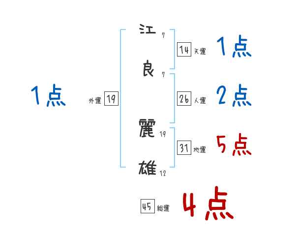 外運![]() | 江良麗雄さんの外運は19画の1つ星!優れた才能を持ちますが、協調性が足りないことも。周りの人と協力する事を意識しましょう。 生活面を象徴する運勢です。外部から受ける影響力を表し、結婚運、家庭運や職場、環境への順応性を表します。 |