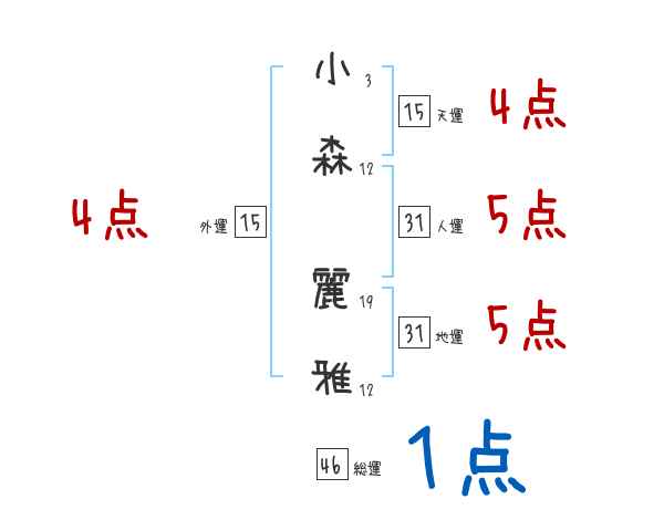天運![]() | 小森麗雅さんの天運は15画の4つ星!人徳があり出世する。順調に物事を進め円満な人生。 家系が持つ宿命的な運勢を表します。祖先から受け継いだ苗字ですので自分の力が及びません。家柄を象徴します。 |