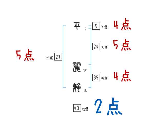 天運![]() | 平麗静さんの天運は5画の4つ星!健康で安泰。協調性に優れ、財産に恵まれる。 家系が持つ宿命的な運勢を表します。祖先から受け継いだ苗字ですので自分の力が及びません。家柄を象徴します。 |