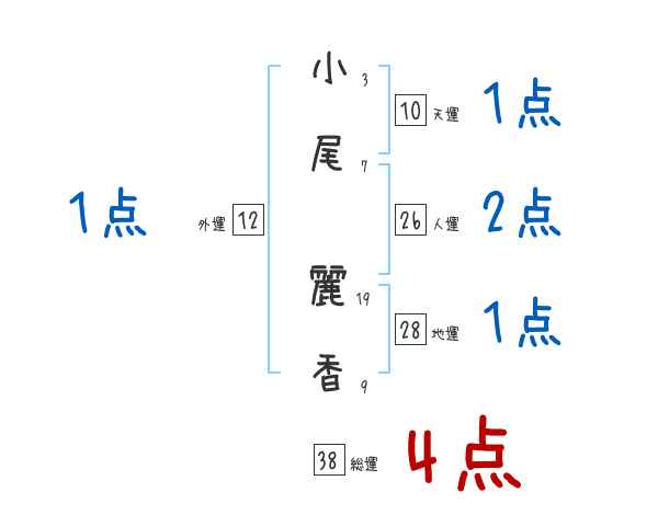 天運![]() | 小尾麗香さんの天運は10画の1つ星!不安を感じやすい傾向。ストレスを抱えないように注意しましょう。 家系が持つ宿命的な運勢を表します。祖先から受け継いだ苗字ですので自分の力が及びません。家柄を象徴します。 |