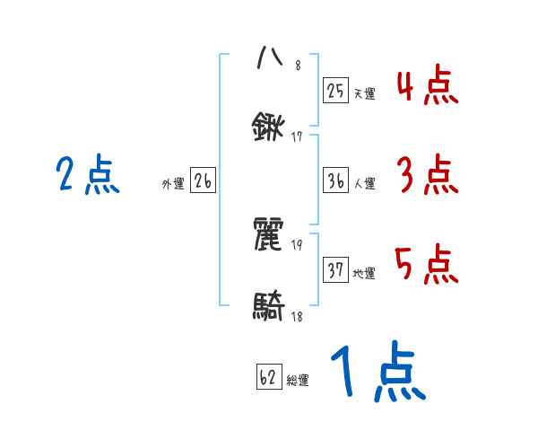 天運![]() | 八鍬麗騎さんの天運は25画の4つ星!個性があり才能があふれる。強運の持ち主で発展する。 家系が持つ宿命的な運勢を表します。祖先から受け継いだ苗字ですので自分の力が及びません。家柄を象徴します。 |