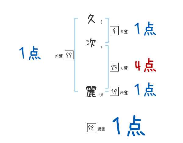 総運![]() | 久次麗さんの総運は28画の1つ星!家庭環境に注意。スポーツで活躍できる能力があるかも。 あなたの人生を表す1番重要な運勢です。生涯を通じて影響する総合運となり、主に50歳以降の晩年期に影響を及ぼします。 |