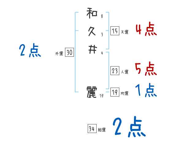 総運![]() | 和久井麗さんの総運は34画の2つ星!独創性に優れるが、自尊心が強く災難に注意しましょう。 あなたの人生を表す1番重要な運勢です。生涯を通じて影響する総合運となり、主に50歳以降の晩年期に影響を及ぼします。 |