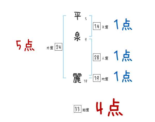 外運![]() | 平泉麗さんの外運は24画の5つ星!家庭運が良く順調な人生。金運にも恵まれる。 生活面を象徴する運勢です。外部から受ける影響力を表し、結婚運、家庭運や職場、環境への順応性を表します。 |