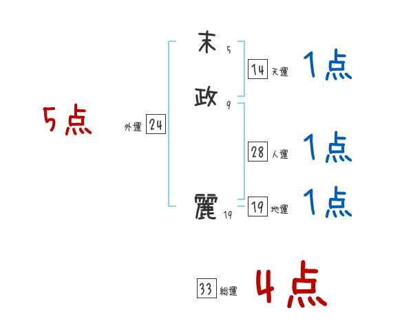 外運![]() | 末政麗さんの外運は24画の5つ星!家庭運が良く順調な人生。金運にも恵まれる。 生活面を象徴する運勢です。外部から受ける影響力を表し、結婚運、家庭運や職場、環境への順応性を表します。 |