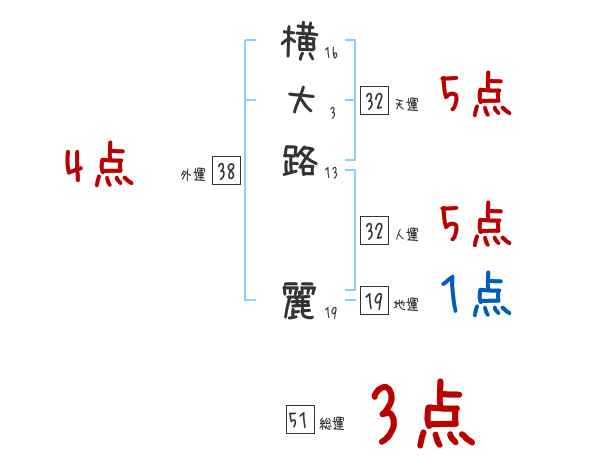 人運![]() | 横大路麗さんの人運は32画の5つ星!柔軟性があり成功する。チャンスが多く金運が良い。 性格や才能などを表す2番目に重要な運勢です。人間関係や協調性、社会的な成功に影響します。主に20歳から50歳ぐらいまでの中年期の運勢を表します。 |