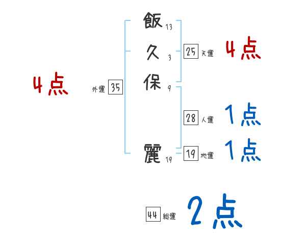 総運![]() | 飯久保麗さんの総運は44画の2つ星!誠実で慎重な性格。物事を考えすぎないように注意しましょう。 あなたの人生を表す1番重要な運勢です。生涯を通じて影響する総合運となり、主に50歳以降の晩年期に影響を及ぼします。 |