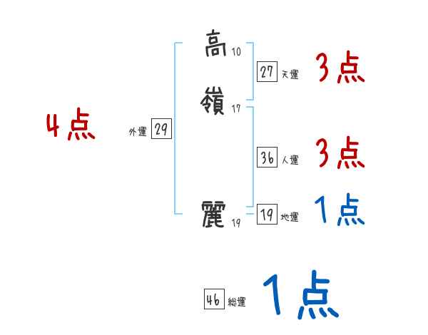 天運![]() | 高嶺麗さんの天運は27画の3つ星!頭脳明晰だが強情で摩擦が多い傾向。孤立に注意。 家系が持つ宿命的な運勢を表します。祖先から受け継いだ苗字ですので自分の力が及びません。家柄を象徴します。 |