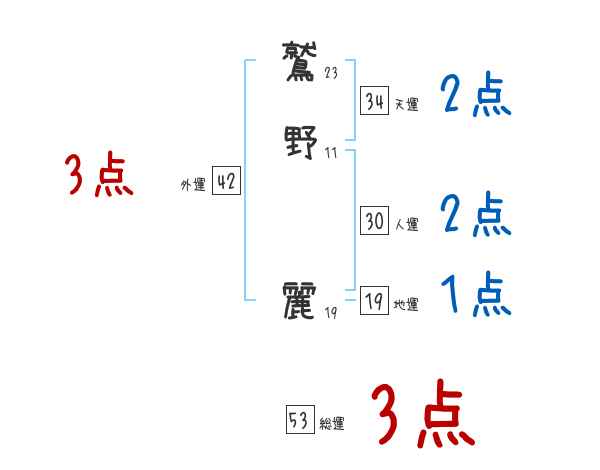 総運![]() | 鷲野麗さんの総運は53画の3つ星!やや見栄っ張りで虚栄心がある。散財に注意。 あなたの人生を表す1番重要な運勢です。生涯を通じて影響する総合運となり、主に50歳以降の晩年期に影響を及ぼします。 |