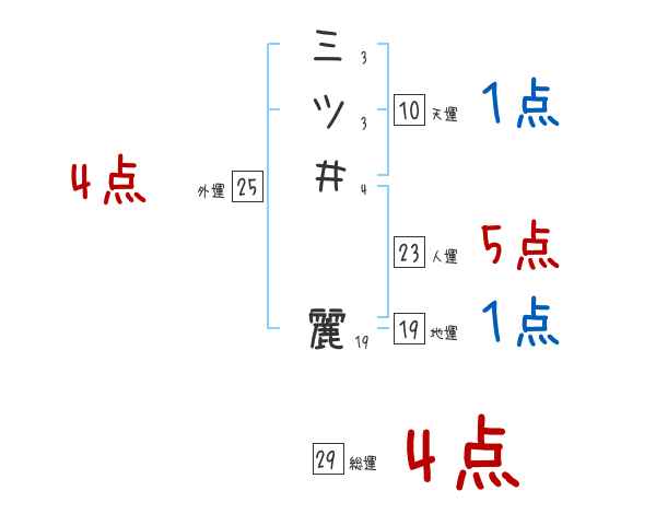 総運![]() | 三ツ井麗さんの総運は29画の4つ星!完全主義で才能がある。厳格な心の持ち主。 あなたの人生を表す1番重要な運勢です。生涯を通じて影響する総合運となり、主に50歳以降の晩年期に影響を及ぼします。 |