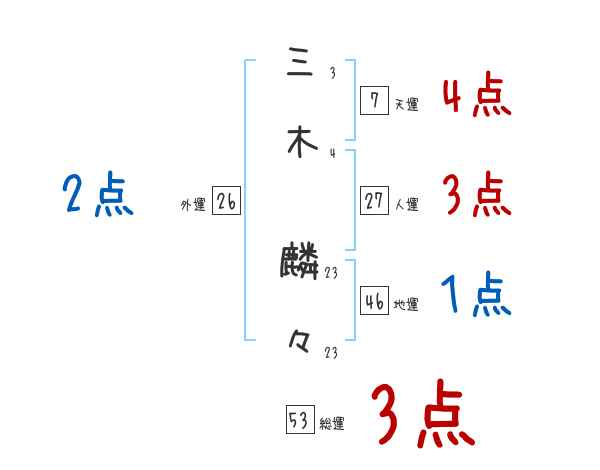 総運![]() | 三木麟々さんの総運は53画の3つ星!やや見栄っ張りで虚栄心がある。散財に注意。 あなたの人生を表す1番重要な運勢です。生涯を通じて影響する総合運となり、主に50歳以降の晩年期に影響を及ぼします。 |