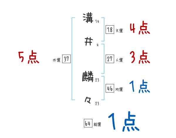天運![]() | 溝井麟々さんの天運は18画の4つ星!情熱的で剛気。忍耐力があり信頼される。 家系が持つ宿命的な運勢を表します。祖先から受け継いだ苗字ですので自分の力が及びません。家柄を象徴します。 |