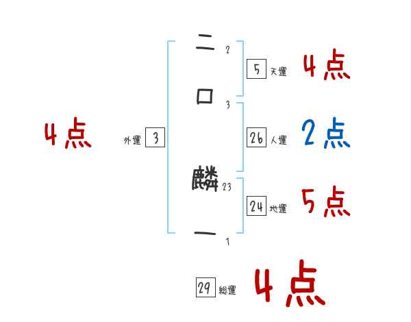 天運![]() | 二口麟一さんの天運は5画の4つ星!健康で安泰。協調性に優れ、財産に恵まれる。 家系が持つ宿命的な運勢を表します。祖先から受け継いだ苗字ですので自分の力が及びません。家柄を象徴します。 |