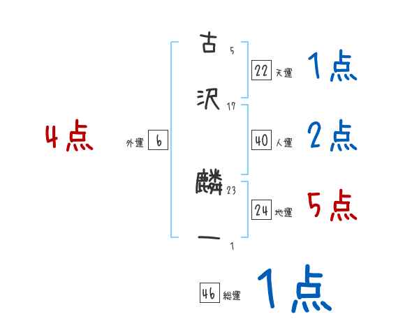 総運![]() | 古沢麟一さんの総運は46画の1つ星!迷走することが多く苦労するかも。目先のことにとらわれないように。 あなたの人生を表す1番重要な運勢です。生涯を通じて影響する総合運となり、主に50歳以降の晩年期に影響を及ぼします。 |