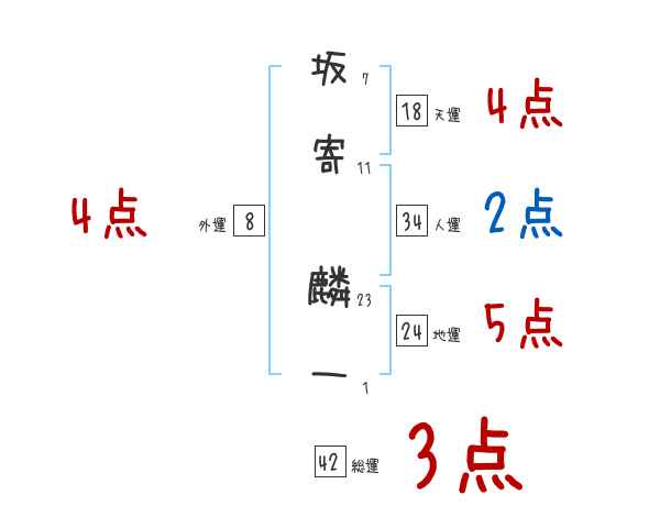 天運![]() | 坂寄麟一さんの天運は18画の4つ星!情熱的で剛気。忍耐力があり信頼される。 家系が持つ宿命的な運勢を表します。祖先から受け継いだ苗字ですので自分の力が及びません。家柄を象徴します。 |