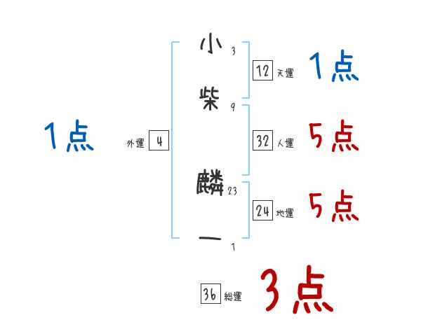総運![]() | 小柴麟一さんの総運は36画の3つ星!先見性が豊かです。多少神経質で苦労することも。 あなたの人生を表す1番重要な運勢です。生涯を通じて影響する総合運となり、主に50歳以降の晩年期に影響を及ぼします。 |