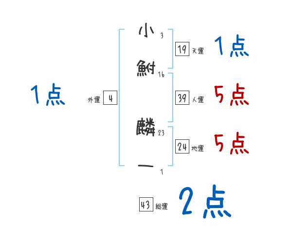 天運![]() | 小鮒麟一さんの天運は19画の1つ星!優れた才能を持ちますが、協調性が足りないことも。周りの人と協力する事を意識しましょう。 家系が持つ宿命的な運勢を表します。祖先から受け継いだ苗字ですので自分の力が及びません。家柄を象徴します。 |