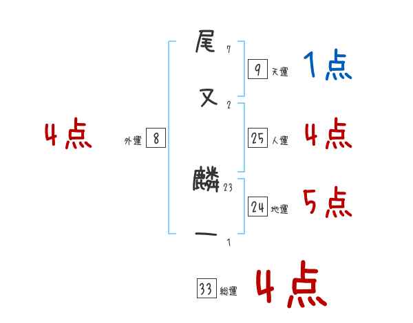 天運![]() | 尾又麟一さんの天運は9画の1つ星!消極的で才能を発揮することが苦手なことも。周りの意見に耳を傾けましょう。 家系が持つ宿命的な運勢を表します。祖先から受け継いだ苗字ですので自分の力が及びません。家柄を象徴します。 |