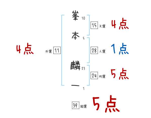 総運![]() | 峯本麟一さんの総運は39画の5つ星!社交性に優れ人望が厚い。人の上に立ち成功する。 あなたの人生を表す1番重要な運勢です。生涯を通じて影響する総合運となり、主に50歳以降の晩年期に影響を及ぼします。 |