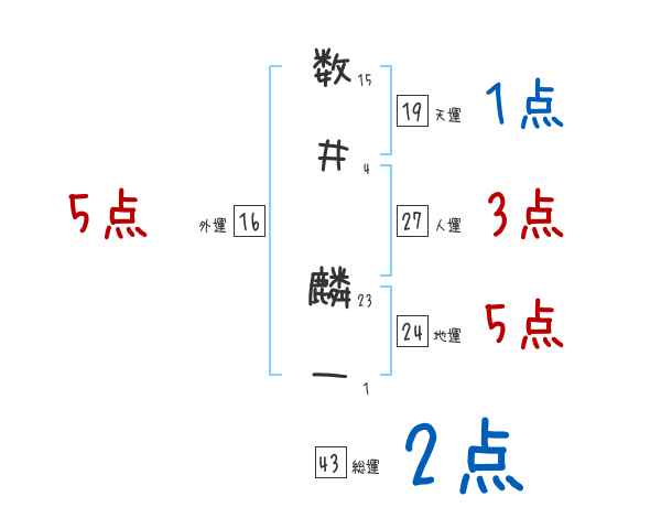 外運![]() | 数井麟一さんの外運は16画の5つ星!人望が厚く大きく発展する。逆転成功が見える。 生活面を象徴する運勢です。外部から受ける影響力を表し、結婚運、家庭運や職場、環境への順応性を表します。 |