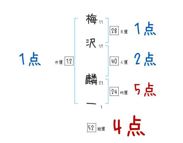 天運![]() | 梅沢麟一さんの天運は28画の1つ星!家庭環境に注意。スポーツで活躍できる能力があるかも。 家系が持つ宿命的な運勢を表します。祖先から受け継いだ苗字ですので自分の力が及びません。家柄を象徴します。 |