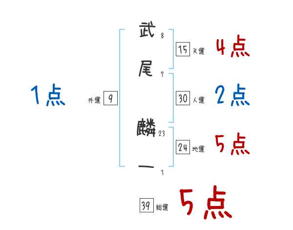 総運![]() | 武尾麟一さんの総運は39画の5つ星!社交性に優れ人望が厚い。人の上に立ち成功する。 あなたの人生を表す1番重要な運勢です。生涯を通じて影響する総合運となり、主に50歳以降の晩年期に影響を及ぼします。 |