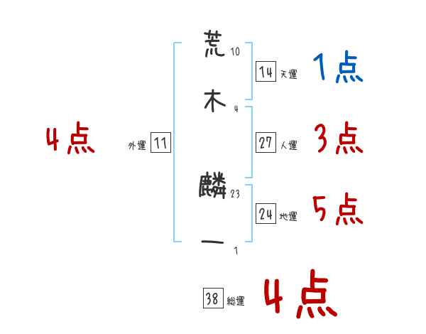 天運![]() | 荒木麟一さんの天運は14画の1つ星!人に対して優しいがストレスを溜め込みがち。人間関係のトラブルを避けるよう気をつけましょう。 家系が持つ宿命的な運勢を表します。祖先から受け継いだ苗字ですので自分の力が及びません。家柄を象徴します。 |
