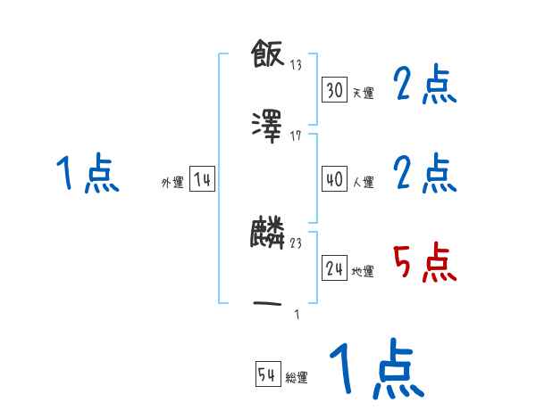 天運![]() | 飯澤麟一さんの天運は30画の2つ星!浮き沈みの激しさに注意しましょう。 家系が持つ宿命的な運勢を表します。祖先から受け継いだ苗字ですので自分の力が及びません。家柄を象徴します。 |