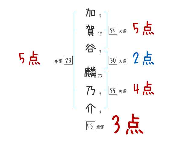 総運![]() | 加賀谷麟乃介さんの総運は53画の3つ星!やや見栄っ張りで虚栄心がある。散財に注意。 あなたの人生を表す1番重要な運勢です。生涯を通じて影響する総合運となり、主に50歳以降の晩年期に影響を及ぼします。 |