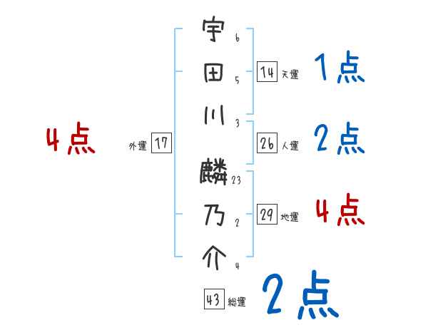 外運![]() | 宇田川麟乃介さんの外運は17画の4つ星!積極的な行動力。地位を気づき財産を手に入れる。純粋な心と直感力。 生活面を象徴する運勢です。外部から受ける影響力を表し、結婚運、家庭運や職場、環境への順応性を表します。 |