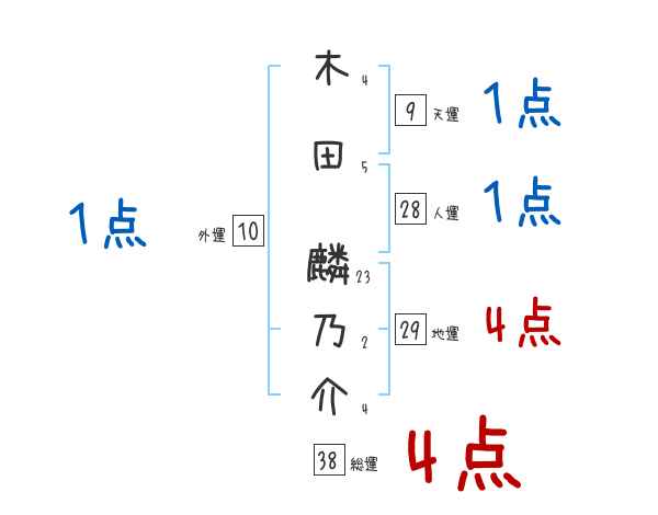 天運![]() | 木田麟乃介さんの天運は9画の1つ星!消極的で才能を発揮することが苦手なことも。周りの意見に耳を傾けましょう。 家系が持つ宿命的な運勢を表します。祖先から受け継いだ苗字ですので自分の力が及びません。家柄を象徴します。 |