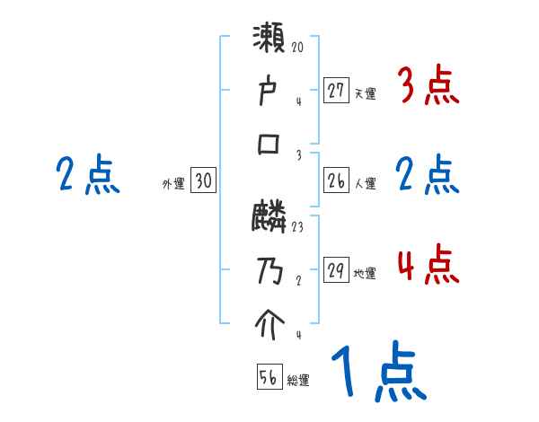 総運![]() | 瀬戸口麟乃介さんの総運は56画の1つ星!消極的で無気力になりがち。誠実な気持ちが必要でしょう。 あなたの人生を表す1番重要な運勢です。生涯を通じて影響する総合運となり、主に50歳以降の晩年期に影響を及ぼします。 |